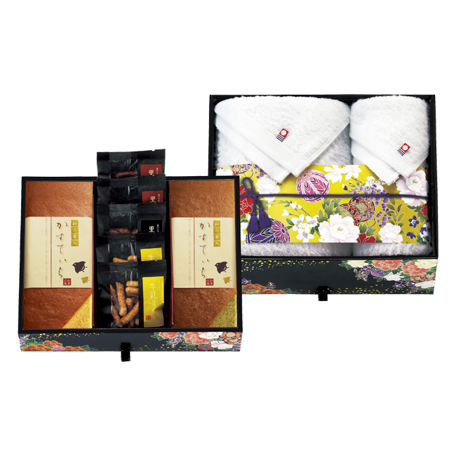 | 内容 | 和三盆糖入かすてぃら(プレーン・抹茶)各1本・かりんとう(黒糖×2・黒胡麻×1・牛乳×2)各15g・フェイスタオル340×750mm・バスタオル600×1200mm 賞味期限:常温で製造日から60日間 |