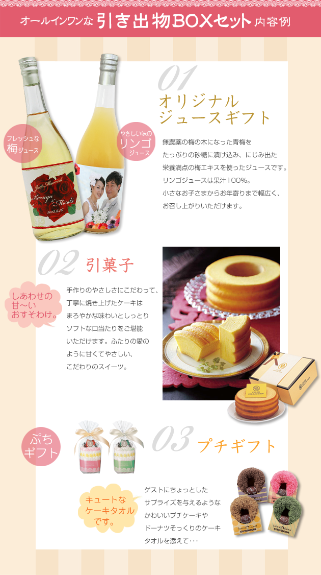 こちらのサイトがオリジナルのギフトセットがあり、二人にとってのラベルシールや写真をつけてもらえるそれが魅力的でした。
